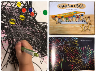 2歳児さんは大好きな絵本「くれよんのくろくん」と同じように「ひっかき絵(スクラッチ)」にチャレンジ〜〜とっても上手に「花火」を上げることが出来ました!!